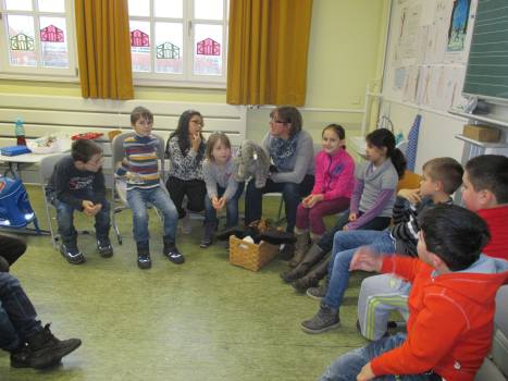 Inzwischen haben schon viele Klassen Besuch bekommen vom Affen Cäsar, dem Spezialisten für Gefühle, vom Adler Arno mit den scharfen Blick auf die Grenzen und von der Elefantendame Slonni, die Expertin für die Gemeinschaft ist. Den Kindern werden in der ersten Doppelstunde Möglichkeiten an die Hand gegeben, Gefühle auszudrücken, und sie lernen, welche Regeln dabei hilfreich sind. In der zweiten Einheit wird der Blick auf die eigenen Stärken und Schwächen sowie auf das Wahrnehmen der eigenen Grenze und der Grenzen der anderen gerichtet. Im dritten Teil wird eine Konfliktbearbeitungsmethode für die Klasse eingeführt. Der Affe Cäsar ist der Experte für Gefühle.