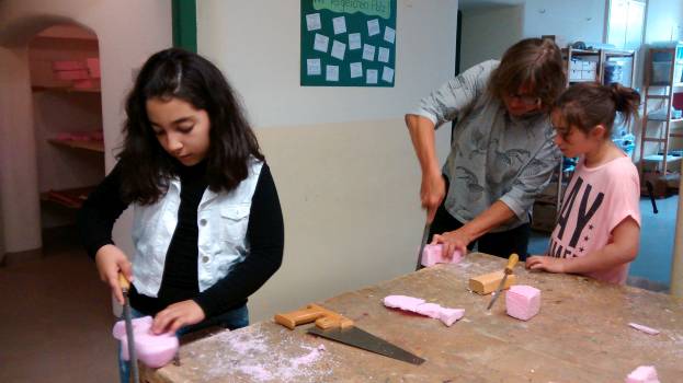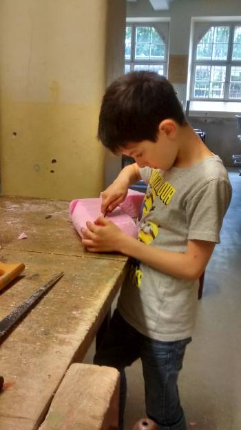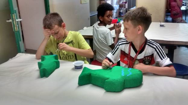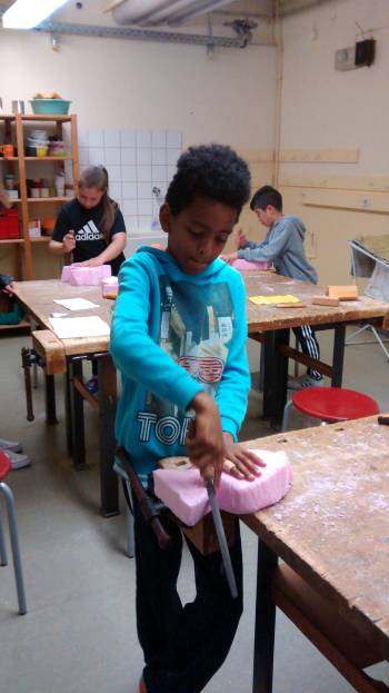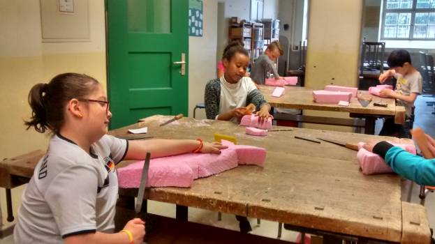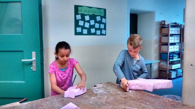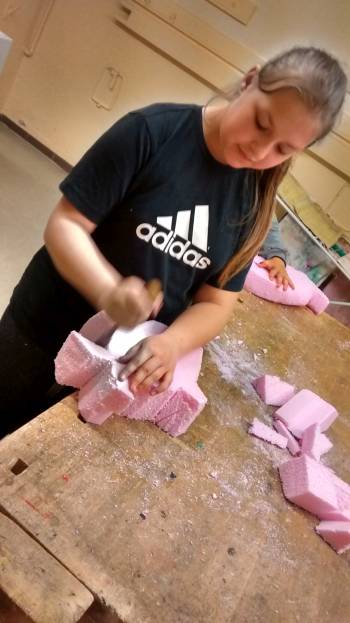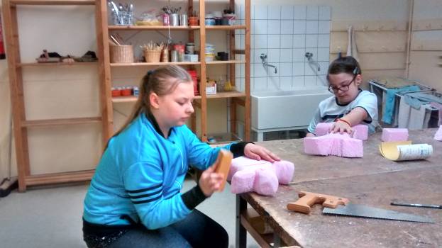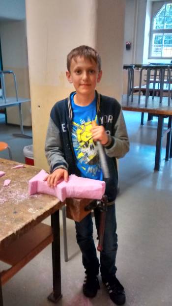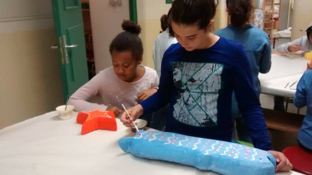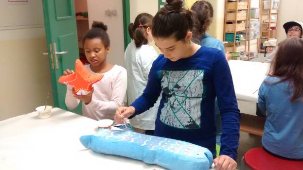 Die Klasse 4c gestaltete für unsere Schule eine Unterwasserwelt. An mehreren Dienstagen wurde in Kleingruppen gemeinsam mit Frau Marquart in der Werkstatt gearbeitet. Aus Styrodur wurden Fische, Seesterne, eine Qualle und eine Wasserschildkröte ausgesägt. Mit Raspel und Schleifpapier wurden die Tiere weiter bearbeitet. ![]() Danach konnten sie mit Farbe verziert werden.