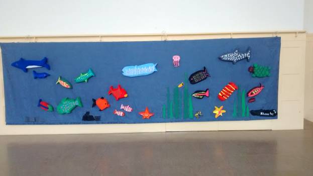 Es sind sehr schöne Produkte entstanden und als Gesamtkunstwerk kommen die kleinen wie großen Fische ganz toll zur Geltung. Ihr könnt das Werk demnächst im Treppenhaus bewundern, gleichzeitig soll es etwas Schall schlucken.