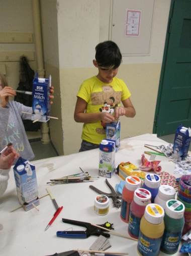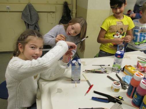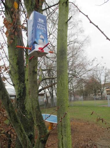 Wir basteln Futtersäulen aus Tetrapackungen und hängen sie im Schulhof auf. Fotos © 2019 I. Marquart |