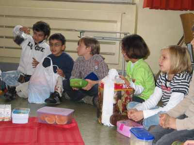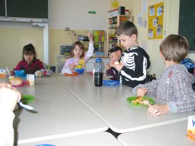 Am letzten Schultag vor den Herbstferien brachte jedes Kind, passend zum gerade gelernten Buchstaben, etwas für unser O-Frühstück mit. Es gab Orangen, Cornflakes, Brot, Honig, Melone, Obst, Mango, Schokolade, Jogurt, Tomaten, Orangensaft, Oliven, Karotten, Ostereier und vieles mehr. Gut gestärkt teilten wir uns in kleine Gruppen auf und probierten die mitgebrachten Spiele aus. So erlebten wir einen etwas anderen, aber sehr schönen Schultag. Fotos © 2008 A. Bergthold |