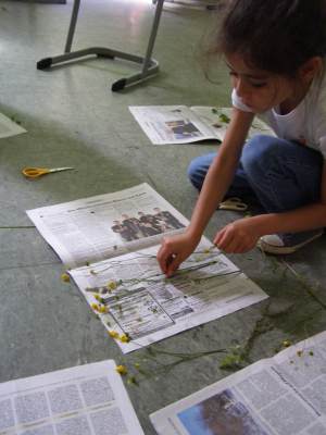 Falte mehrere Lagen Zeitungspapier auseinander. Lege auf 1 Hälfte sorgfältig nebeneinander die gesammelten Wiesenblumen. Falte die Zeitung vorsichtig wieder zu und beschwere sie mit Büchern. Wechsle nach 1 bis 2 Tagen die feuchten Zeitungsseiten aus. Wiederhole das Ganze so lange, bis die Blumen trocken und flach gepresst sind. Klebe die getrockneten Pflanzen auf ein Blatt Papier oder in ein Heft. |