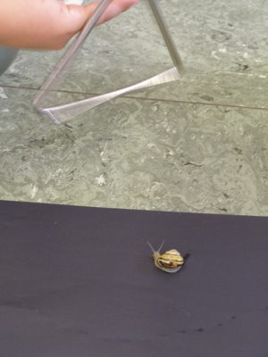 Das tust du: | Erzeuge mit der Triangel einen lauten Ton in der Nähe der Schnecke, ohne sie zu berühren | ||