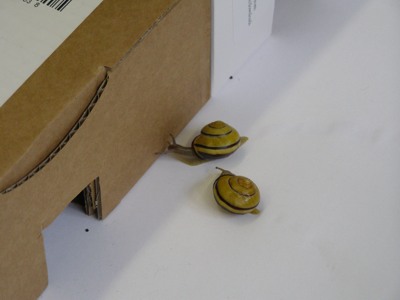 oder mehrere Schnecken in der Nähe der Schachteln ab.