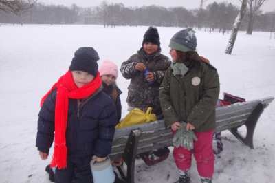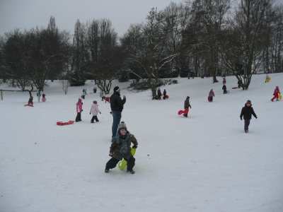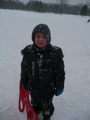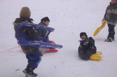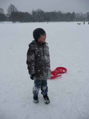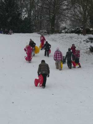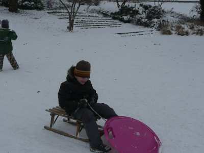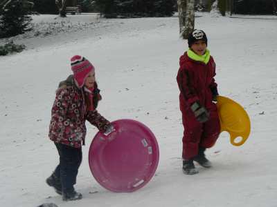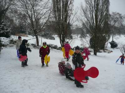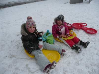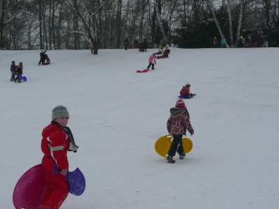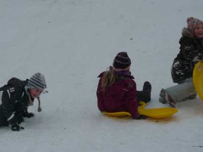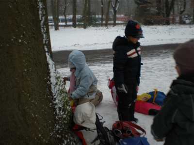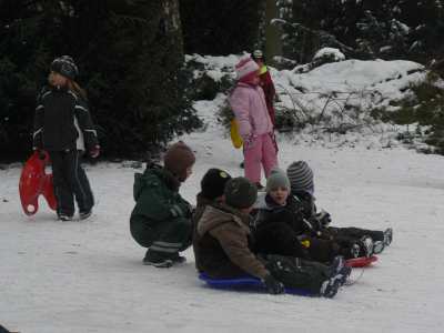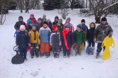 A,a,a, der Winter der ist da... ...und weil er so viel Schnee mitgebracht hat, waren am 8.1.10 alle 1. Klassen der Georg-Paul-Amberger-Schule beim Schlittenfahren. Mit Bobs, Schlitten und Poporutscher ausgerüstet fuhren wir zuerst mit dem Bus durch das verschneite Nürnberg. Am Luitpoldhain hatten wir den ganzen Schlittenhügel für uns alleine. Da hieß es: „Aus der Bahn!“ Abfahren und Hinaufsteigen macht hungrig. |