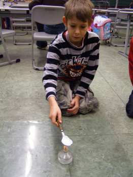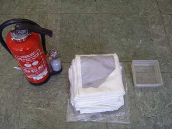 Und so haben wir die Versuche durchgeführt: Bei allen Versuchen mit offenem Feuer haben wir vorher ein paar Sicherheitvorkehrungen getroffen: Als Untergrund verwenden wir eine nicht brennbare Glasplatte. Falls ein Feuer einmal außer Kontrolle gerät, stehen ein Feuerlöscher und eine Löschdecke bereit. Und zum Ablöschen bzw. Abkühlen von kleineren brennenden Gegenständen ist ein Gefäß mit Wasser gefüllt, in das die brennenden Dinge gekippt werden können (Wasser nicht bei brennendem Öl verwenden!). So, jetzt kann's aber losgehen. Mit Holz: Mit Orangenschalen: Mit Papier: Mit Eiweiß: Mit Käse: Mit Eigelb: Mit Seife: Mit Kreide: Mit Zucker: Mit Blei (aus einer Packung "Blei gießen"): Mit Wachs: Ergebnis: Das Wachs schmilzt sehr schnell und wird flüssig.