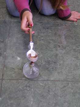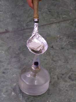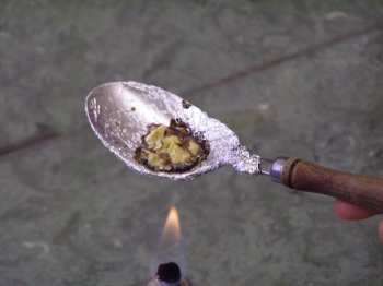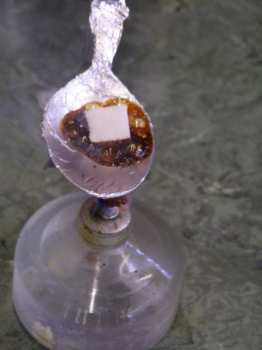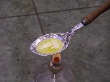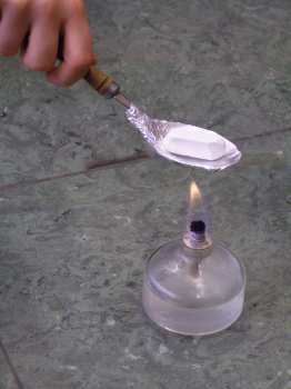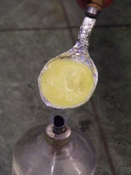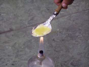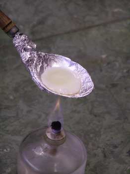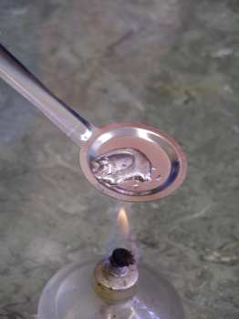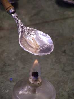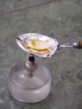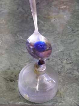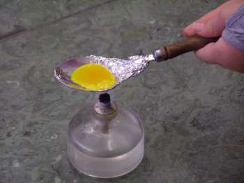 Umwickle den Löffel mit der Alufolie (um ihn später leichter reinigen zu können) und lege jeweils etwas von dem Testmaterial darauf. Stelle eine Kerze unter den Löffel und warte, bis er heiß wird (Löffel dabei mit einem Topflappen anfassen oder einen Löffel mit Holzstiel verwenden!). |