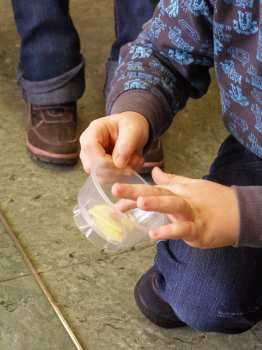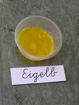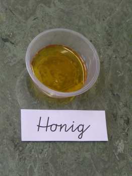 Das haben wir herausgefunden: Nach einem Tag im Tiefkühlfach: Das Eigelb wird hart. Es ist erstarrt. Bei Zimmertemperatur taut es nur langsam wieder auf. Das Eiweiß wird steinhart. Man kann den Becher herumdrehen, ohne dass es herausfällt. Wasser gefriert zu Eis und wird steinhart. Nach einiger Zeit im Zimmer verflüssigt sich das Eis wieder zu Wasser. Der Honig wird sehr hart. Man kann daran lutschen. Er schmeckt dann wie Honigeis. Der Käse wird fest. Man kann ihn leicht brechen. Die Schokolade wird sehr hart. Man kann kaum noch etwas abbeißen. Die Butter wird fest. Darum kann man auch mit Butter aus dem Kühlschrank kaum ein Brot streichen. Nach kurzer Zeit in der Zimmerwärme wird sie aber wieder weich und streichfähig. Manche Dinge musst du aber gar nicht einfrieren, um sie erstarren zu lassen. Beim flüssigen Blei (siehe Versuch 1!) und beim flüssigen Wachs zum Beispiel genügt es, sie in kaltes Wasser zu kippen und schon erstarren Blei und Wachs wieder und werden so fest wie zuvor. |