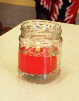 die Kerze in das Glas (sie darf später nicht schwimmen, also