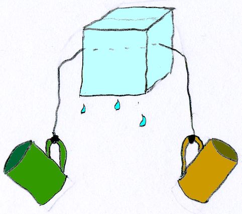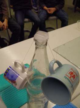 alleine herunterfallen!). Binde an die Enden des Drahts zur Beschwerung jeweils eine Tasse. Lege den Draht nun auf den Eiswürfel und lasse die Tassen jeweils an einer Seite der Flasche herunterhängen (Die Tassen dürfen den Tisch nicht berühren!). |