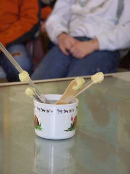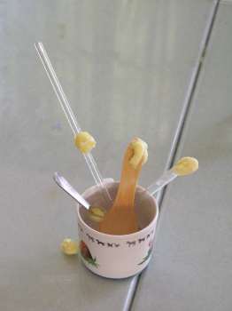 Das tust du: | Klebe je ein Butterkügelchen an den Griff der Löffel und stelle die