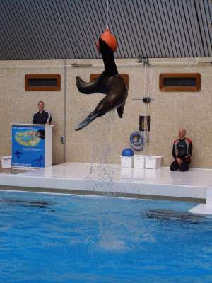 Zuerst waren die kalifornischen Seelöwen dran, die uns mit allerlei Kunststücken begeisterten und auch ein bisschen nass spritzten: Als krönenden Abschluss durften wir dann noch die Schwimmkünste der Delfine bewundern: