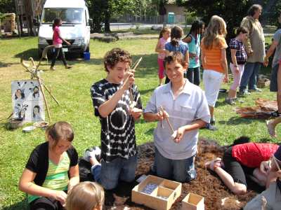 Wir haben einen kleinen Stein genommen und rieben ihn an einem festen Stein. Mit einem Bohrer aus Holz und Schnur und einer Spitze bohrten wir ein Loch durch den Stein. Wir mussten Kunstsehnen als Kettenschnur nehmen. Es gab Federn, Perlen, Steine und Leder zum Verzieren. Am Schluss mussten wir alles auffädeln. Wir hatten viel Spaß.