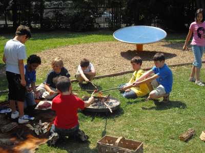 Mit Messer und Holzklötzen teilten wir Holz in kleine Späne. Häuptling Vierauge machte dann mit uns Feuer. Dann schnitten wir Fleisch mit dem Feuerstein und brutzelten es an Stangen über dem Feuer.