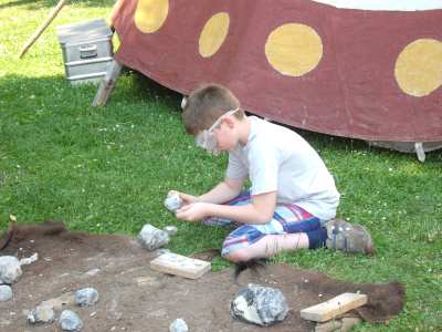 Mit einem Stein mussten wir auf einen Feuerstein draufschlagen bis er die Form einer Pfeilspitze hatte. Danach mussten wir einen Stock holen und auf einer Seite eine Rillle reinschneiden und dort mit Kunstsehne die Spitze befestigen.