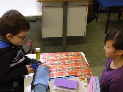 Frau Kühnlein stellte aus ihrem Fundus passendes Material zur Verfügung, und schon konnte es losgehen. Gemeinsam überlegten die Kinder, wie sie die Vorderseite ihrer Karten künstlerisch gestalten wollten. Konzentriert wurden dann die Überlegungen in die Tat umgesetzt. Da sah man viele Kinder schneiden, kleben und malen und wie immer halfen die "Großen" tatkräftig mit, wenn bei den "Kleinen" mal etwas nicht so klappen wollte. Anschließend wurde noch am Text gefeilt, der in die Karten geschrieben wurde. Eine kleine Auswahl der schon fertigen Karten siehst du hier: Fotos © 2010 D. Härtl |