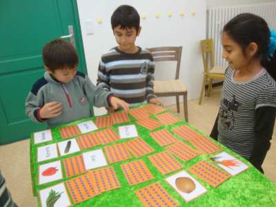 Ernährungsprogramm „Die kleine Lok“ der Verbraucherzentrale Nürnberg durch. An drei Stationen lernten die Kinder viele wichtige Dinge über unsere Lebensmittel. Station 1 war ein Obst- und Gemüsememory.