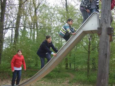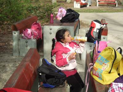 Am letzten Schultag vor den Osterferien waren wir, die Klasse 2c, gemeinsam mit unserer Patenklasse 5c auf dem Spielplatz am Forstweiher in Eibach. Nach einer Stunde Fußmarsch mussten wir uns zunächst stärken.
