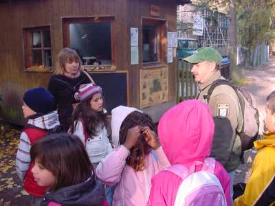 „Wir waren im Wald mit der Klasse 3c und 3b. Im Waldererlebniszentrum waren Thomas, Claudia und Amira, die mit uns Spiele gemacht haben. Wir haben einen Kreis gemacht und uns den Erzählreifen gegeben. Da mussten wir unseren Namen sagen und erzählen, was uns interessiert.“(Ilda) ![]() „Wir haben Tiere gesehen, die echt aussahen. Aber die Tiere waren nicht lebendig, sie waren ausgestopft. Die Tiere, die wir gesehen haben waren zum Beispiel ein Uhu oder ein Feldhase usw. Alles war schön. Am liebsten wäre ich gleich noch einmal hingegangen.“ (Benedicte) ![]() „Dann sind wir zum Baumtelefon gegangen.“ (Melih) „Eine Frau hat ein Tier am Baumstamm gespielt (z.B. Klopfen für den Buntspecht) und wir mussten hören, welches Tier sie gemeint hat. Mir hat das Spiel gut gefallen.“ (Daner) „Wir waren dann auf einer Wippe und