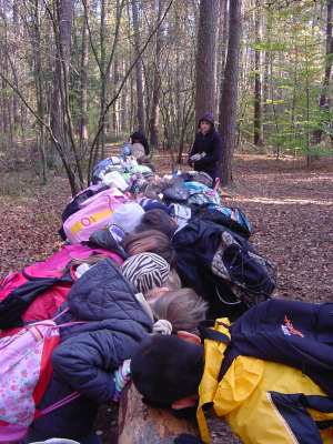 Nein! Nicht alle gleichzeitig laufen!!! ![]() Geschafft!! „Thomas erklärt uns das Eichhörnchenspiel: Erst stehen alle im Kreis, dann bekommt jeder 3 Kastanien. Dies muss jeder verstecken und sich das Versteck merken. Dann gingen wir zur Wippe und danach mussten wir unsere Kastanien wieder finden.“ (Laura) „Wir haben dann die Kastanien suchen müssen und Thomas hat bis 10 gezählt“. (Alexander) ![]() Unter dem Moos gibt es gute Verstecke! Die fleißigsten Eichhörnchen! ![]() Diese Eichhörnchen hätten den Winter