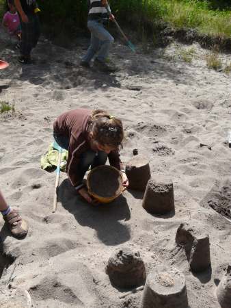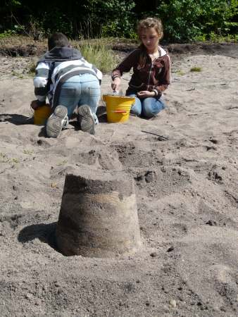 Gruppe baute eine riesengroße Sandburg, eine Gruppe befreite das Sandband von
