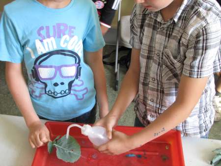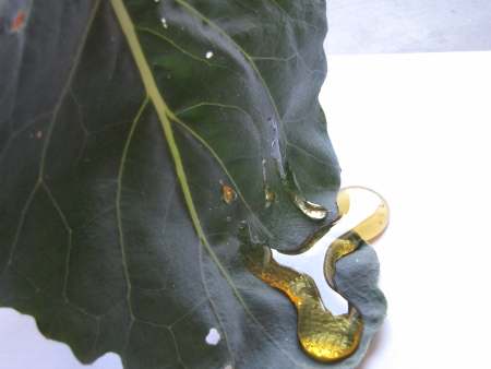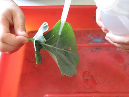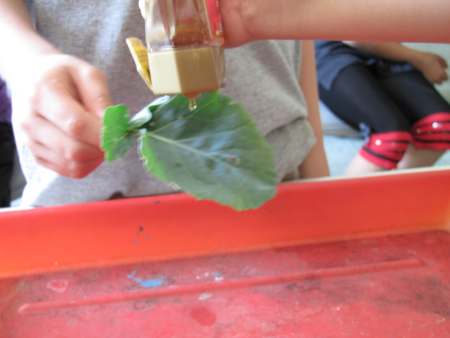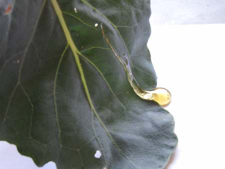 Wenn du in einem Glas Wasser und Öl zusammengießt, schwimmt das Öl immer oben und vermischt sich nicht mit dem Wasser. Aber was passiert, wenn du auf die Ölschicht einen Tropfen Tinte drückst? Tinte besteht hauptsächlich aus Wasser. Die Tinte ist aber schwerer als das Öl und will deshalb nach unten sinken. Dabei möchte sie so wenig Kontakt wie möglich zum Öl haben. Also macht sich die Tinte ganz klein - und die kleinste mögliche Form ist eine Kugel. Als Kugel durchwandert die Tinte jetzt die Ölschicht. Ist sie an der Grenze zwischen Öl und Wasser angekommen, muss sich die Tinte erst einmal anstrengen, um diese Grenzschicht zu durchstoßen. Das dauert eine Weile. Hat sie es geschafft, kann sich die Tinte endlich im Wasser auflösen und breitet sich in wunderschönen Formen aus. Nie mehr waschen - das wäre doch ein Traum, oder? Wir müssen uns täglich waschen, damit unsere Haut wieder sauber wird und der ganze Dreck verschwindet. Hast du schon gewusst, dass sich dazu manche Pflanzen nicht waschen müssen? Ein Blatt vom Kohlrabi zum Beispiel ist nie schmutzig. Wie macht es das? Ganz einfach. Das Blatt hat eine Oberfläche, auf der weder Wasser noch Schmutzteilchen haften können. Sogar Honig läuft an dem Blatt einfach ab. Wir haben es für dich ausprobiert: Wenn du Lust hast, probier diese Experimente doch einfach mal zu Hause aus. Bei dir klappt es bestimmt auch! Und wenn dir in den Ferien mal langweilig ist: Hier gibt es noch viel mehr Experimente zum Ausprobieren: Viel Spaß! Fotos © 2012 D. Härtl |
