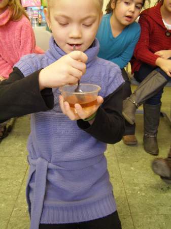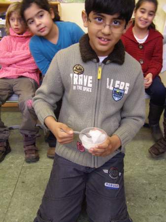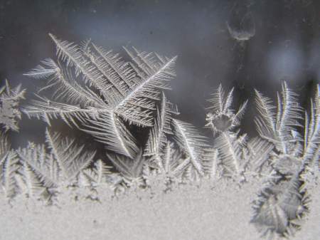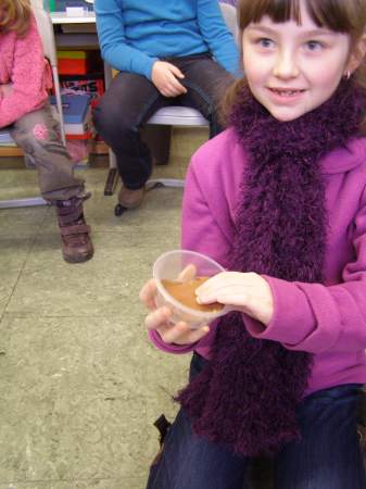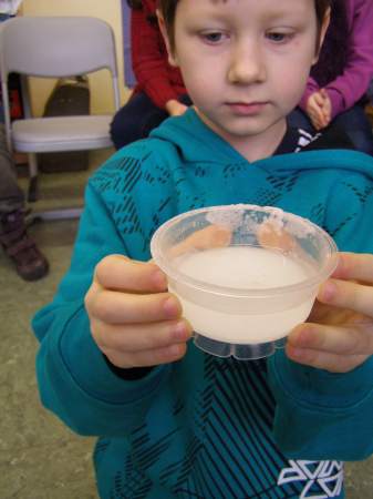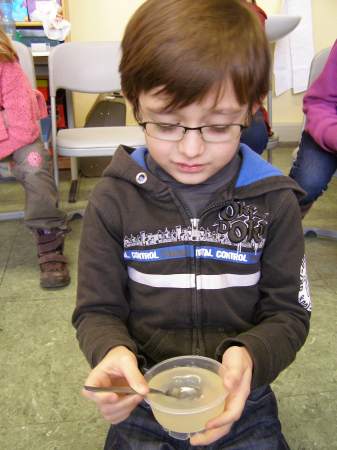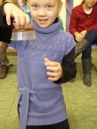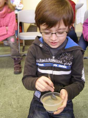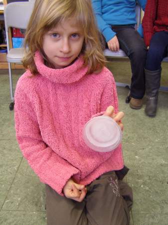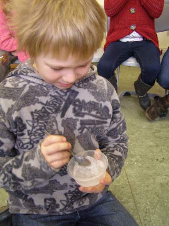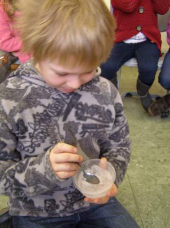 Das Außenthermometer zeigt -12° Celsius an! Gut, dass wir im warm geheizten Klassenzimmer sitzen. Aber was ist das? An den Fensterscheiben sind über Nacht Blumen gewachsen - Eisblumen! Wunderschöne, zarte Gebilde aus gefrorenem Wasser! Diese Eisblumen kannst du an normalen Fensterscheiben kaum noch sehen, dazu sind die Gläser viel zu gut wärmeisoliert. Aber an unseren einfach verglasten Fensterscheiben wachsen sie prima, wenn es in der Nacht sehr kalt und die Luftfeuchtigkeit zwischen den Scheiben genügend hoch ist. Wir haben die Kälte gleich noch ausgenutzt und ein paar Experimente durchgeführt. Wir wollten nämlich wissen, was mit verschiedenen Stoffen passiert, die über Nacht in der Kälte gestanden sind: Wasser gefriert natürlich zu einem Eisklumpen: Knetmasse wird starriger, bricht aber beim Kneten nicht: Honig wird zäh, er läuft nicht einmal aus dem Gefäß, wenn man es umdreht: Mit Wasser verrührter Zucker wird zu einer zähen, sirupartigen Masse, friert aber nicht fest ein: Öl wird sehr dickflüssig: Beim mit Salz vermischten Wasser haben wir eine Zweiteilung gesehen: Am Boden bildet sich eine harte Salzschicht, oben drüber steht flüssiges Wasser (auch bei -12°!): Essig verwandelt sich in eine geleeartige Masse: In den nächsten Tagen wollen wir noch andere Stoffe untersuchen. Probiers doch auch mal aus, so lange die Kälte noch anhält! Als Gefäß kannst du alle alten Verpackungen z.B. von Joghurt oder Pudding verwenden, sie dürfen nur nicht aus Glas sein! Fotos © 2012 D. Härtl |