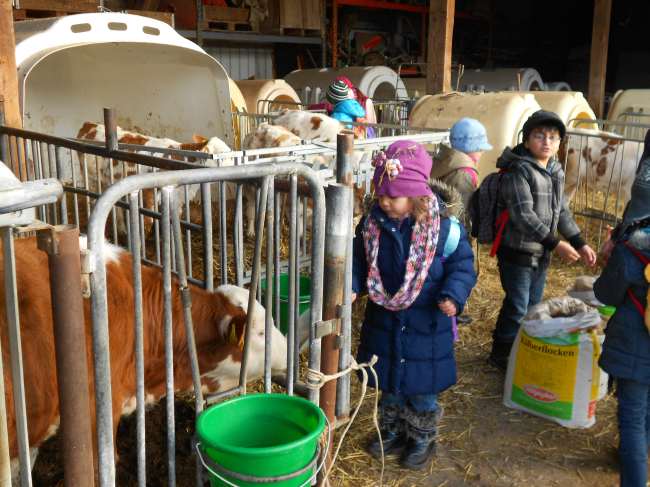 Zuerst durften wir die Kälber mit Müsli füttern und ausgiebig streicheln, was