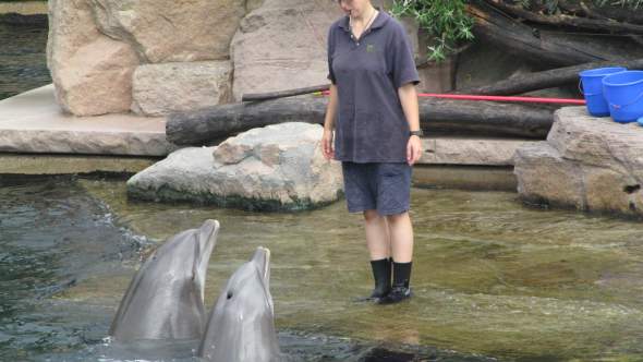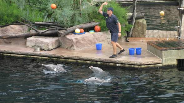 Leider hat es anfangs sehr stark geregnet. Das konnte aber unsere gute Stimmung nicht vermiesen. Zuerst haben wir, gut geschützt von einigen Regenschirmen, die Giraffen, die Totenkopfäffchen, die Pinguine und Eisbären sowie die Raubtiere angeschaut. Als Höhepunkt des Ausflugs gab es dann die Delfinshow in der neuen Tiergartenlagune. Pünktlich dazu hat es auch zu regnen aufgehört und es kam sogar etwas die Sonne heraus. Es ist schon sehr erstaunlich, was die Delfine alles können! Nach einer kurzen Stärkung bei den Tiergartenkiosken fuhren wir dann in einem völlig überfüllten Linienbus wieder nach Hause. Fotos © 2014 D. Härtl |
