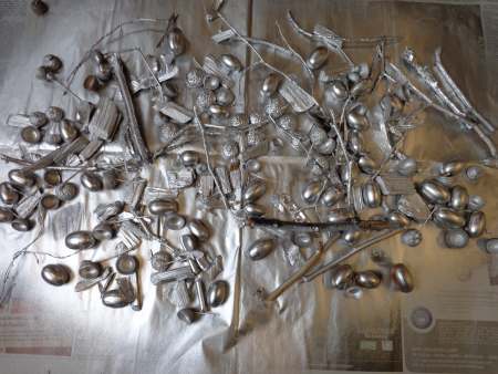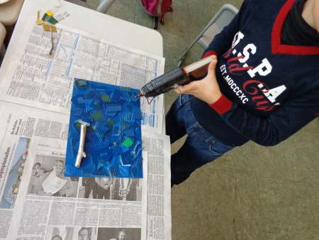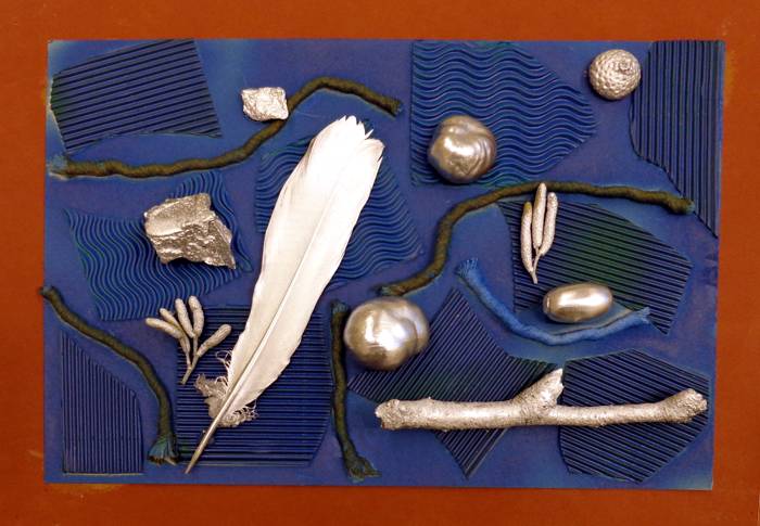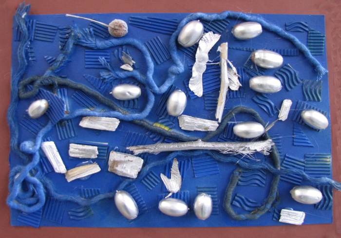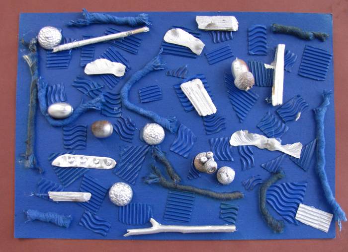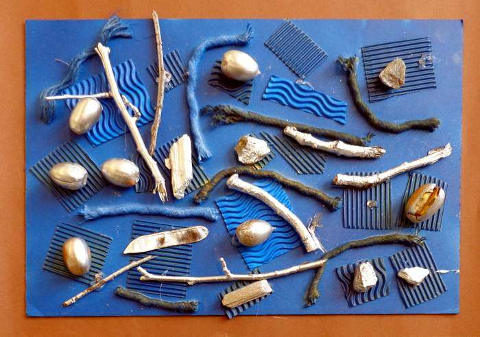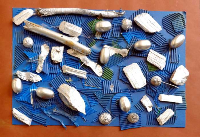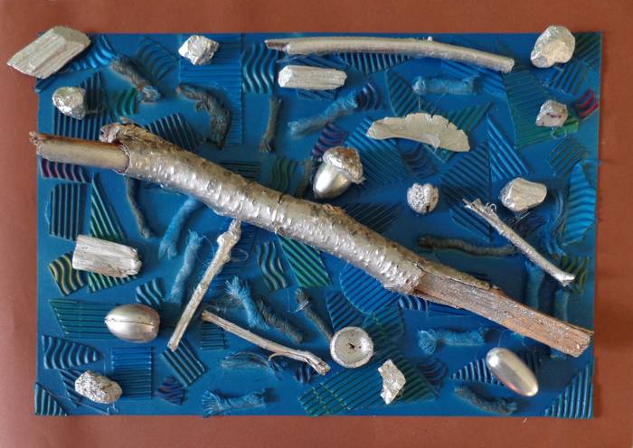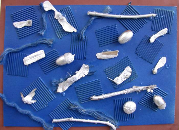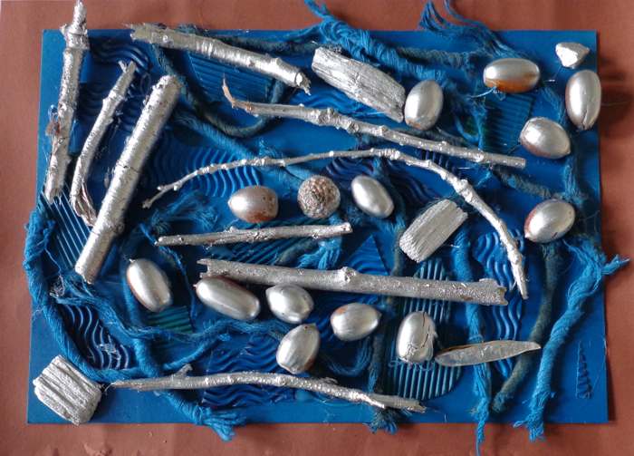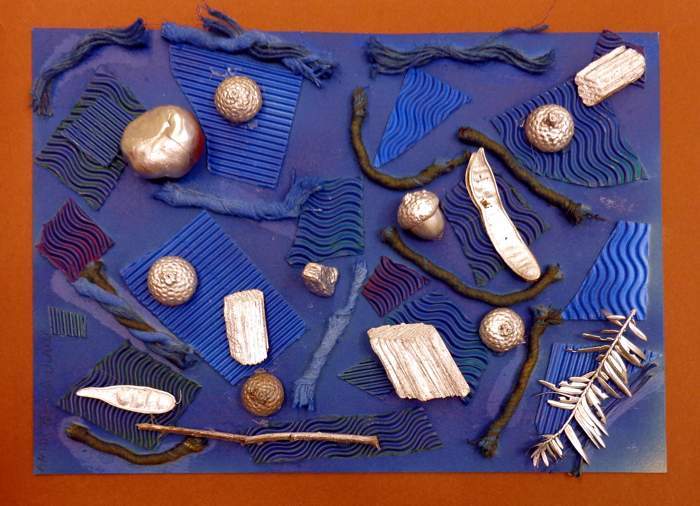 Wir haben Früchte und Äste von Bäumen und Sträuchern, kleine Steine, Holzstückchen und andere interessante Sachen gefunden. Daraus wollten wir Collagen für den Kunstunterricht fertigen. Zuerst haben wir allerlei Reste wie zum Beispiel alte Wellpappe und Wollreste auf einen Karton geklebt. Dieses Gebilde wird nun mit blauer Farbe übersprüht. Die gesammelten Fundstücke wurden zunächst mit Silberfarbe übersprüht. Anschließend (nach dem Trocknen) haben wir sie mit Heißkleber auf unseren blauen Untergrund geklebt. Jetzt fehlt nur noch ein schöner Rahmen drumherum, und fertig ist die Blau-Silber-Collage. ![]() ![]() ![]() ![]() ![]() ![]() ![]() ![]() ![]() Im Original sind die Bilder natürlich noch schöner... Zur Zeit hängen Sie an der Wand vor Zimmer 207! Fotos © 2013 D. Härtl |