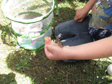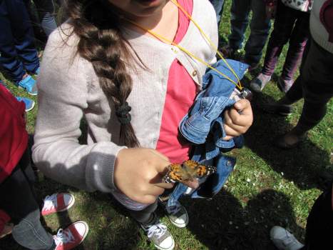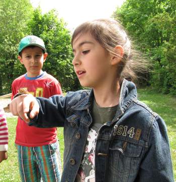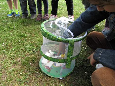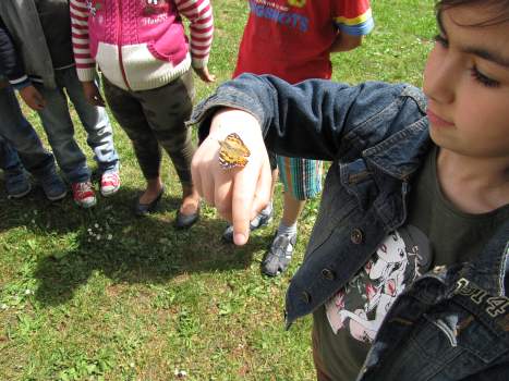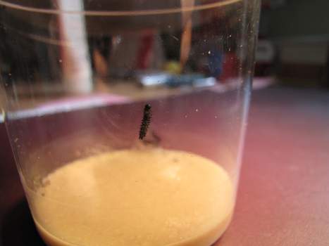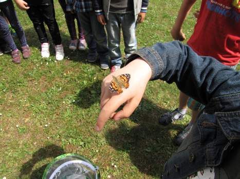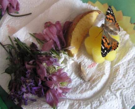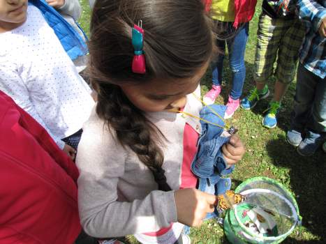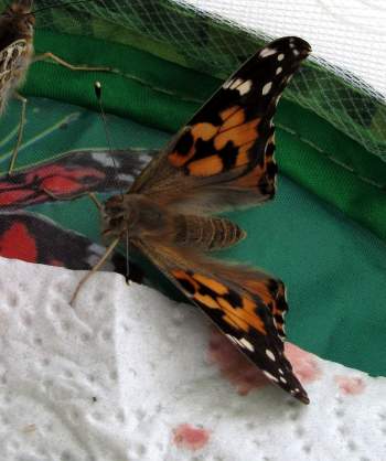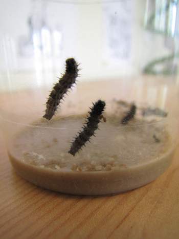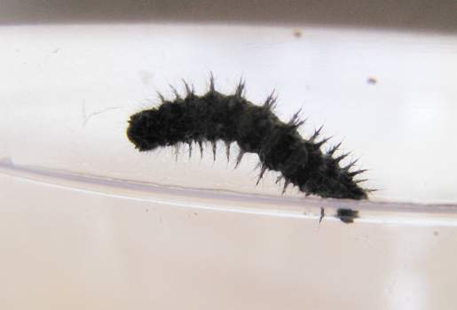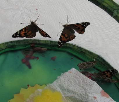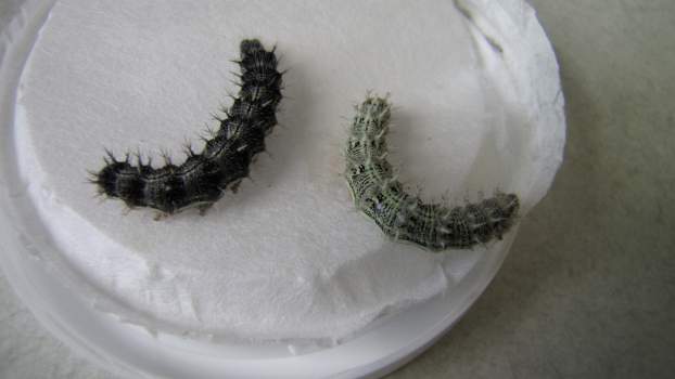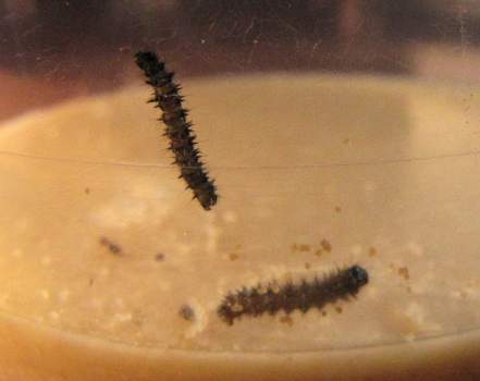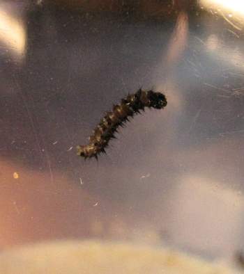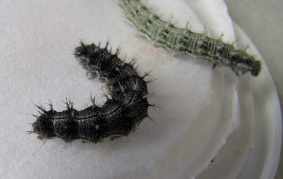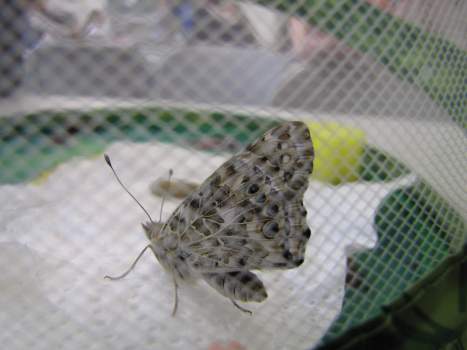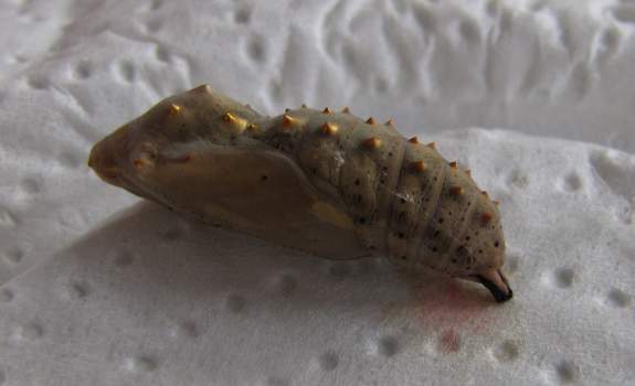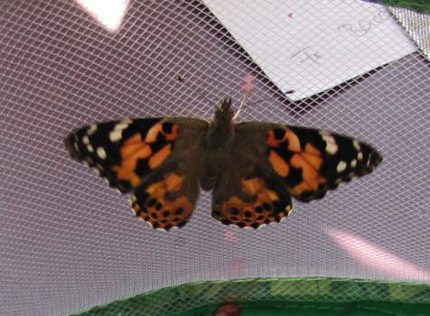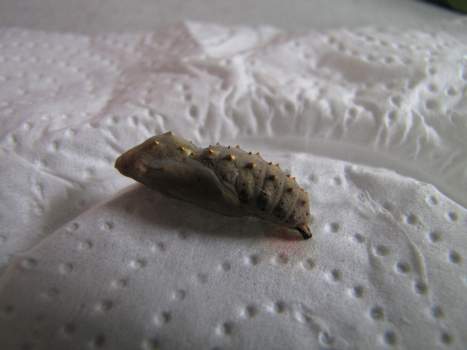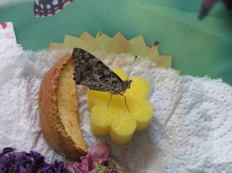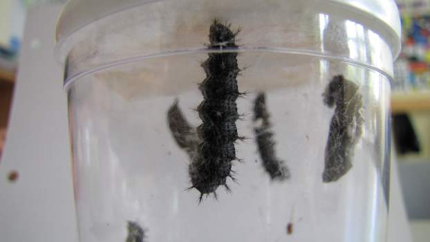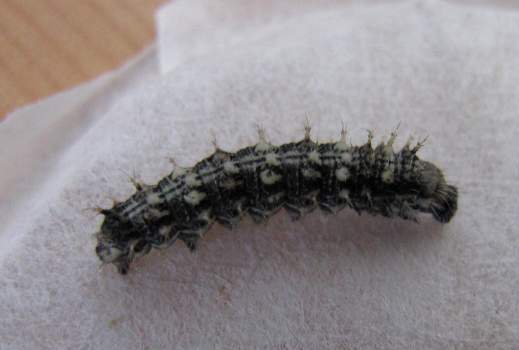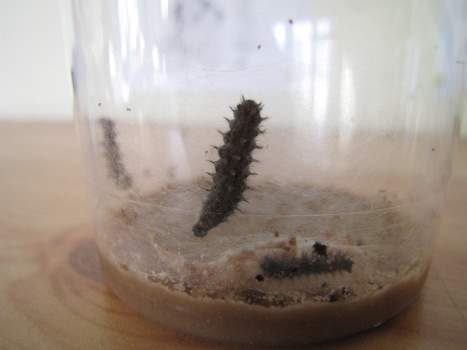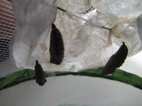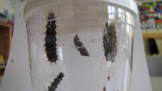 Ganz klein waren die Raupen anfangs, aber schon sehr gefräßig. ![]() Und so konnten wir beobachten, wie sie fast jeden Tag etwas größer wurden. Zwischendurch mal kurz die Haut abgestreift, wenn sie zu eng wurde, und dann weitergefressen. Bis sie in unserem warmen Klassenzimmer nach etwa 3 Wochen satt waren und sich verpuppt haben. In diesem Zustand konnten wir sie auch vom engen Glas in den großzügigen Käfig umsetzen. Nach etwa 1 Woche schlüpften dann aus den Puppen putzmuntere Schmetterlinge, die sich sofort auf die im Käfig bereitgelegten Obststücke und das Zuckerwasser stürzten. Wenigen Tage später, nachdem wir die Schmetterlinge ausgiebig beobachtet hatten, ließen wir sie dann auf unserem Schulgelände frei, aber nicht, ohne ihnen noch alles Gute zu wünschen! Und was sind das jetzt eigentlich für Schmetterlinge? Fotos © 2015 D. Härtl |