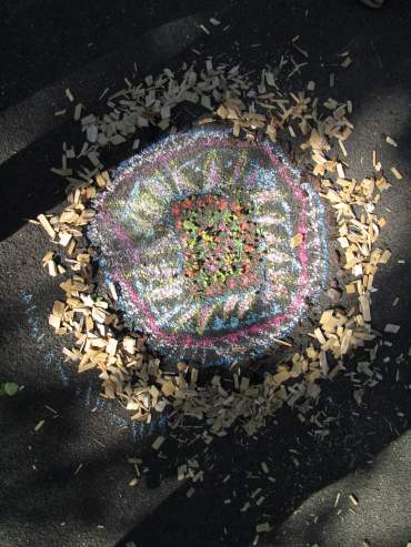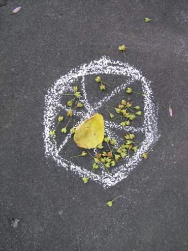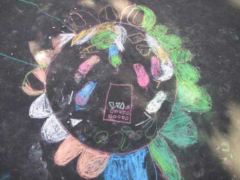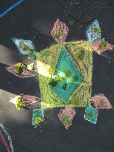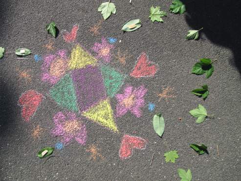 Diesmal wollten wir unsere reichlich vorhandene Tafelkreide (die wir ja wegen der gerade erhaltenen interaktiven Tafeln nicht mehr benötigen) zur Gestaltung von Bodenkunstwerken in Verbindung mit Naturgegenständen einsetzen. Mit viel Fantasie gestalteten die Kinder Bodenbilder unter dem Motto "Flächenformen und Natur":