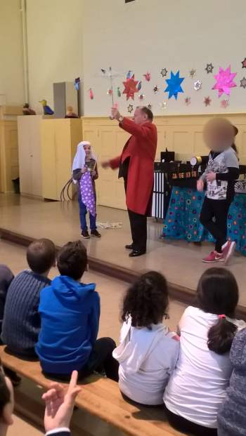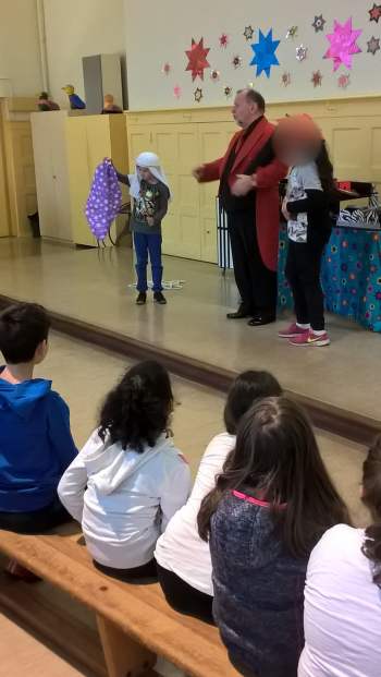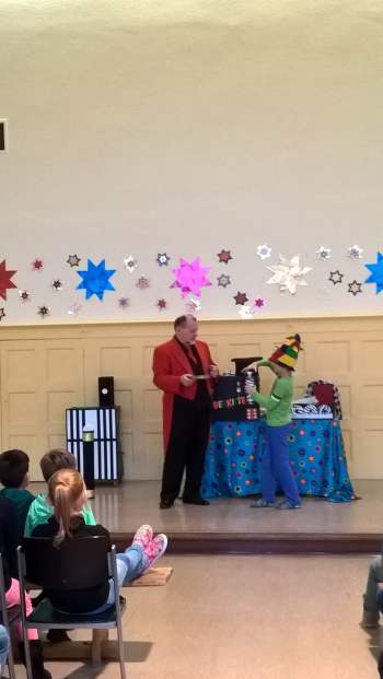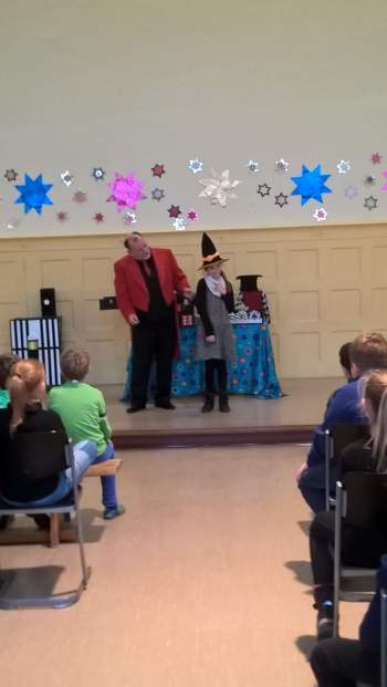 Zuerst verriet er uns 3 Zaubersprüche, damit wir ihn beim Zaubern kräftig unterstützen konnten. Dann zauberte er mit verschiedenen Gegenständen Geld, Gold, Bälle, einen Schirm… Dabei ließ er sich immer von Kindern helfen, das machte uns besonders viel Spaß. Und wer vom Zaubern noch nicht genug hat: Noch mehr Zauberei gibt es bei der Vorstellung für unsere 1. Klassen am 20.12.2016.