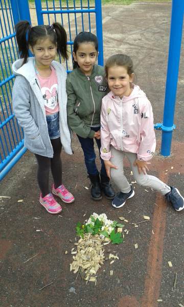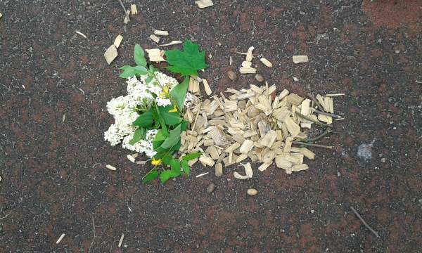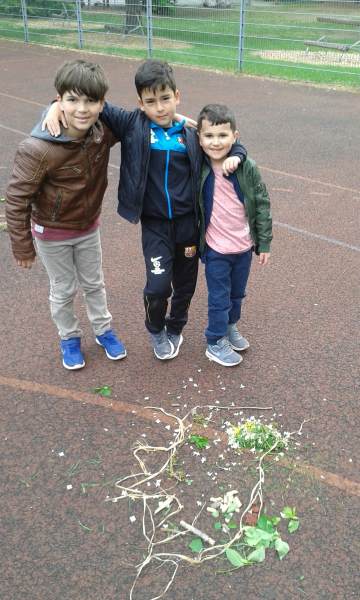 Aus Materialien vom Schulhof und Frau Krellers und Bedirhans Garten haben wir Land-Art Bilder gelegt.