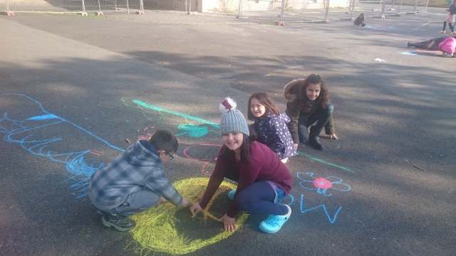 herrlichstem Sonnenschein malte die Klasse 1a mit ihren Patenkindern