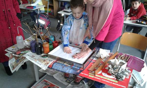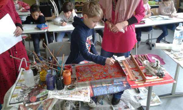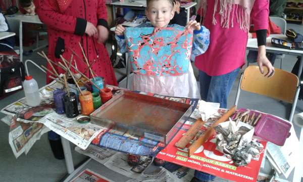 Im März kamen Frau Simsek, eine Schülermama und Frau Iyi in unsere Klasse 1c und haben mit den Kindern Bilder in Ebru- Technik hergestellt. Es sind tolle Muster entstanden.