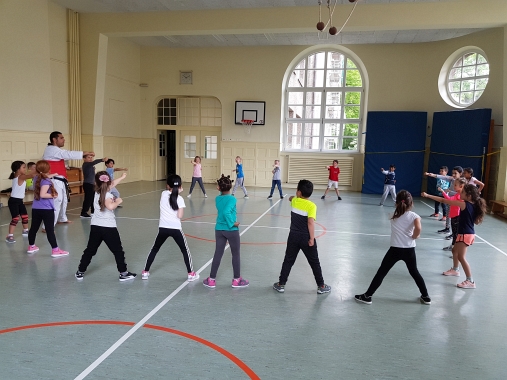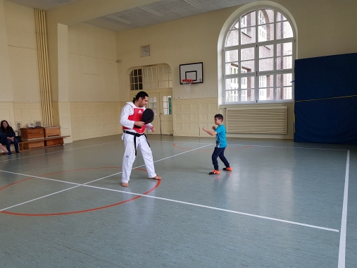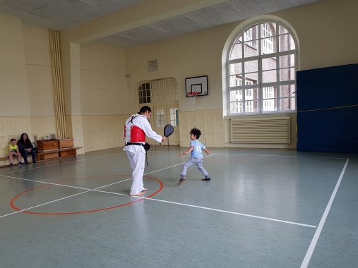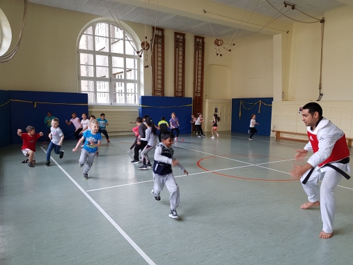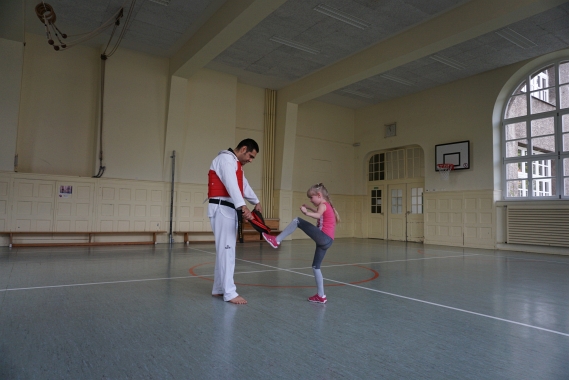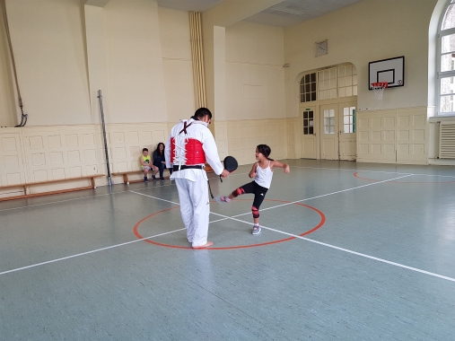 Nach einem kurzen Aufwärmen zeigte uns Herr Emtekin ein paar einfache Grundübungen des Taekwondo.