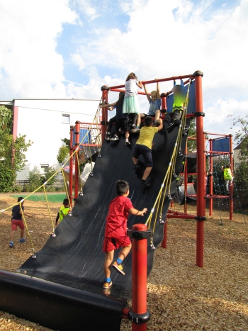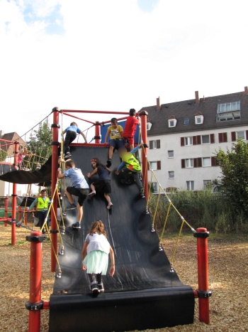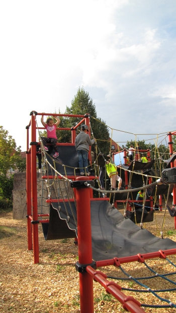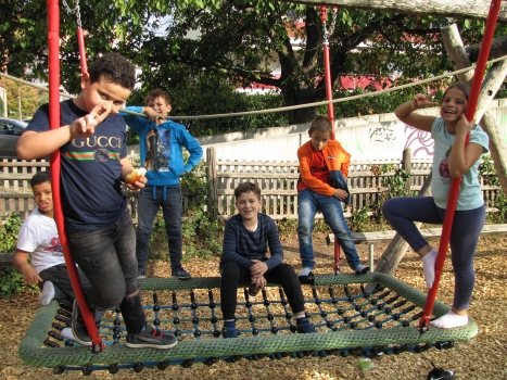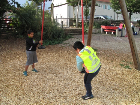 Nach 1/2 Stunde Fußmarsch sind wir am Spielplatz angekommen - und sofort haben die Kinder mit Feuereifer alle Spielgeräte ausprobiert. Nach fast 3 Stunden herumtoben sind wir dann gegen Mittag wieder zur Schule zurückgegangen. Leider hat uns auf dem Rückweg ein starker Regenschauer überrascht, sodass wir etwas "begossen" an der Schule wieder ankamen. Trotzdem war es ein sehr schöner Ausflug, bei dem sich die Patenkinder kennenlernen konnten. Fotos © 2018 dh |