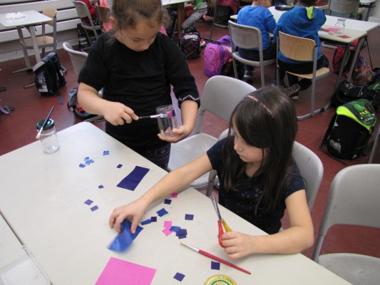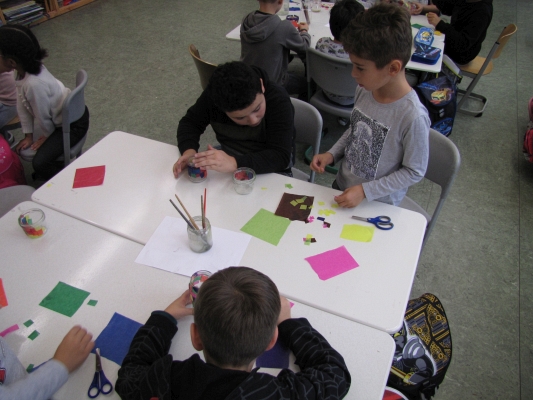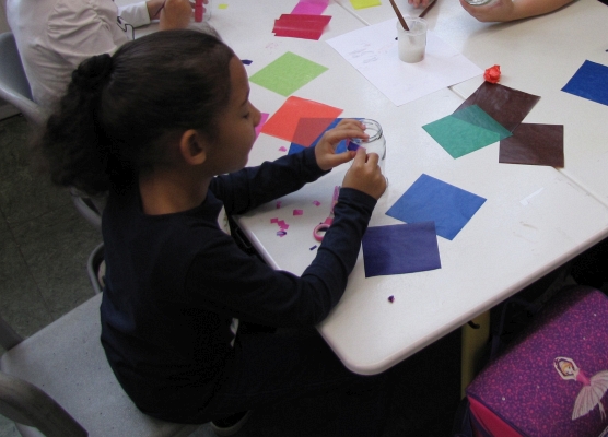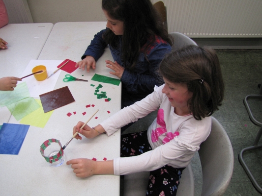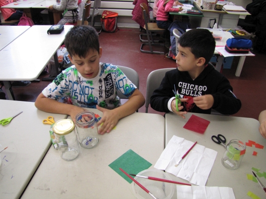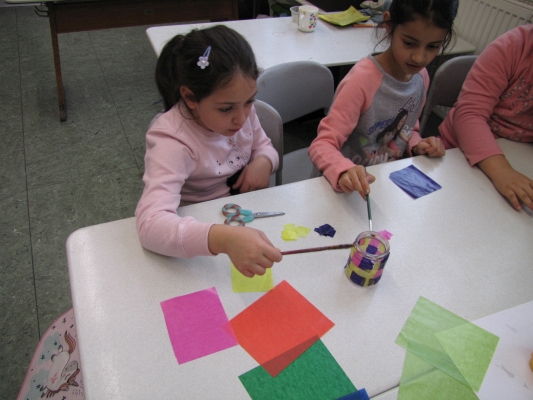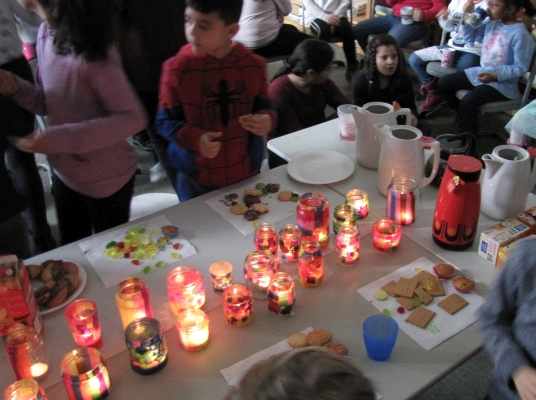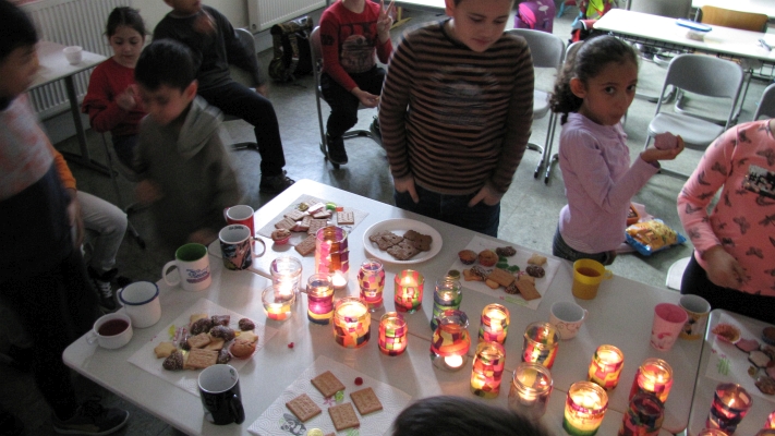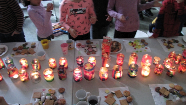 Ein mitgebrachtes Glas wurde mit kleinen, aus Transparentpapier geschnittenen Quadraten beklebt. Daraus entstand am Ende mit einem Teelicht im Glas eine schöne Martinslaterne. Besonders schön leuchten die Laternen natürlich, wenn es im Zimmer noch etwas dunkel ist. ![]() Kurz nach dem Martinstag haben wir uns dann zu einer gemeinsamen kleinen Martinsfeier getroffen und die Lichter angezündet.