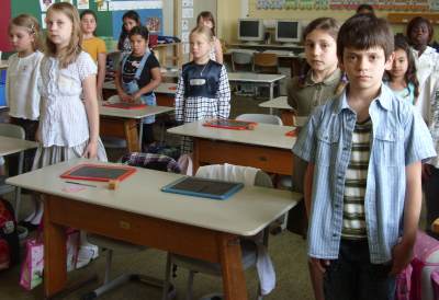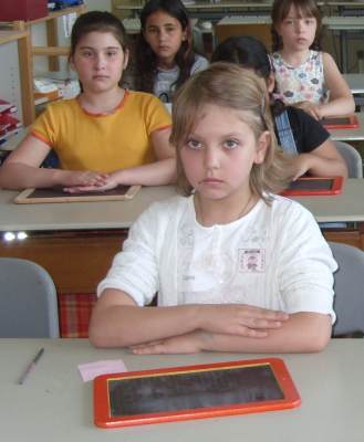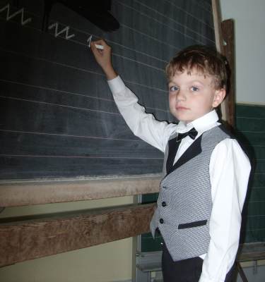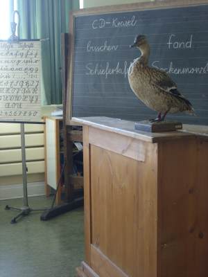 Nach der Pause wurde es dann ernst, wir spielten eine halbe Stunde Unterricht wie früher. Wir sprachen im Chor, schrieben ein Diktat zur Ente und lernten das alte volkstümliche Lied „Froh zu sein bedarf es wenig“. Dabei mussten wir uns anstrengen, alles richtig zu machen, sonst mussten wir uns in die Ecke stellen. Als Belohnung bekamen wir zum Schluss noch ein Fleißkärtchen. S. Reitzner-Kohler Fotos © 2011 S. Reitzner-Kohler
