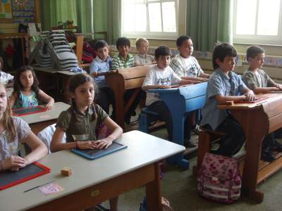 Während der Projektwoche lernten 80 Schüler und Schülerinnen der ersten bis vierten Jahrgangstufe den Schulalltag vor 100 Jahren kennen. Dafür hatte uns das Schulmuseum alte Schulmöbel zur Verfügung gestellt.