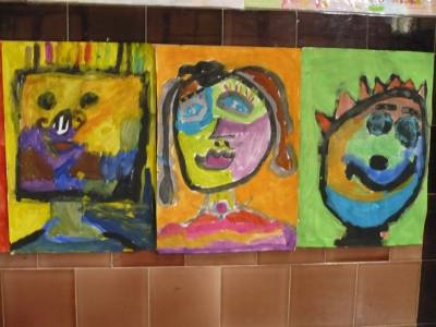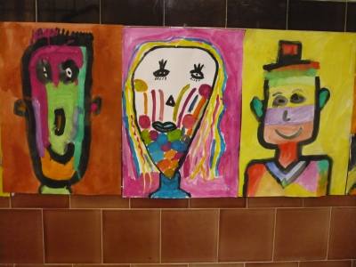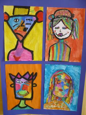 Zuerst überlegten wir uns verschiedene Kopfformen und Frisuren. Danach malten wir die Gesichtslinien schwarz. Nun färbten wir die Köpfe bunt und malten einen einfarbigen Hintergrund dazu.