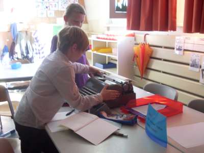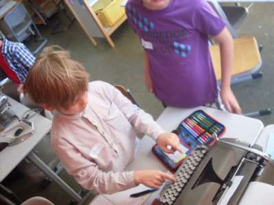 An einer ca. 50 Jahre alten mechanischen Schreibmaschine probierten die Kinder aus, wie schwierig das Tippen früher war. Mit Kohlepapier stellten sie Durchschläge, also Kopien her.