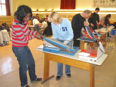 Und es kamen wirklich sehr viele Eltern, um unter der Leitung der Lehrerinnen Simone Schmitt und Silvia Schmidt die Ausstattung unserer Mathematik-Lernwerkstatt weiter voranzutreiben. Da wurde geschnitten, gemalt, ausgefüllt, geklebt und laminiert - und ganz nebenbei kamen natürlich auch viele Gespräche zwischen Eltern, Lehrern und Schulleitung zustande. Wir bedanken uns jedenfalls recht herzlich für die fleißige Mithilfe unserer Eltern, ohne die sich die reichhaltige Ausstattung der Lernwerkstatt nicht in überschaubarer Zeit hätte realisieren lassen! Fotos © 2008 W. Bartel |