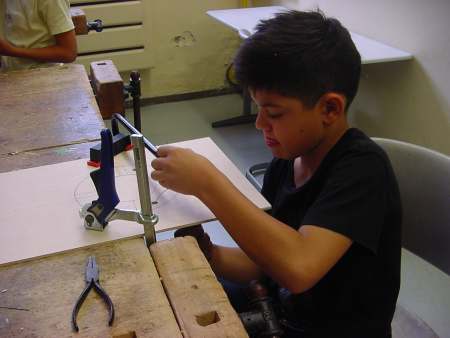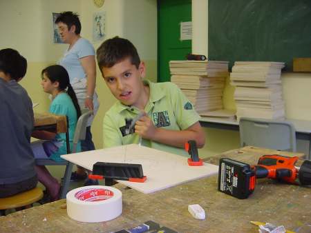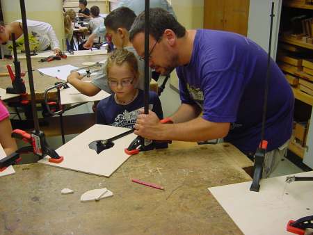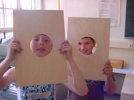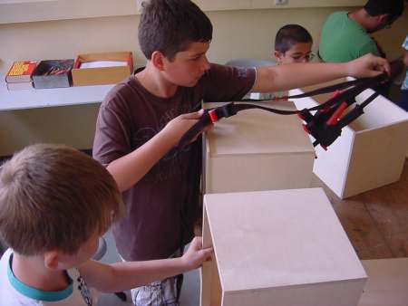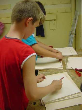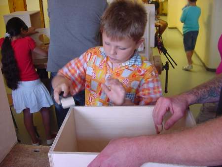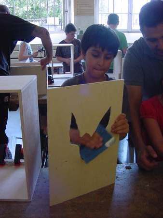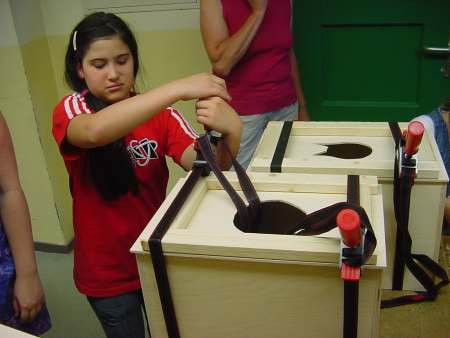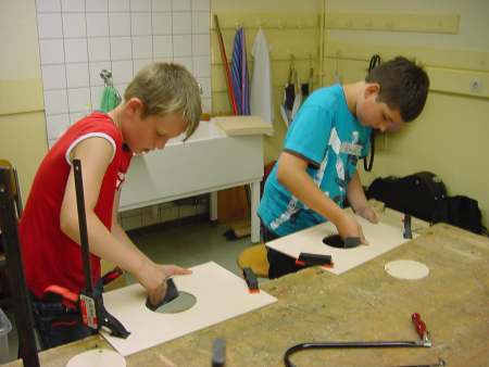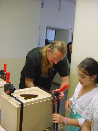 Zuerst durften die Kinder eine eigene Form für das Schallloch aufzeichnen und mussten es dann sauber mit der Laubsäge aussägen. Hier offenbarten sich schon wahre Handwerker. Das Projekt wird unterstützt durch die „Familienfreundliche Schule“. Vielen Dank! Weitere Berichte folgen in den nächsten Tagen …... und weiter gehts mit dem Cajon bauen. Mit Hilfe von fleißigen Vätern wurden die Seiten zusammengebaut und an der Vorderseite "Metalldrähte" angebracht, die später den typischen Cajon-Klang erzeugen.
