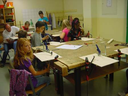 Praktikantin vom Kinderkunstraum und einige Eltern hilfreich zur Seite.