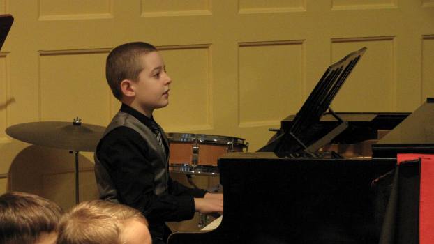 Sie wird dabei von einem Mädchen aus der 3b am Klavier