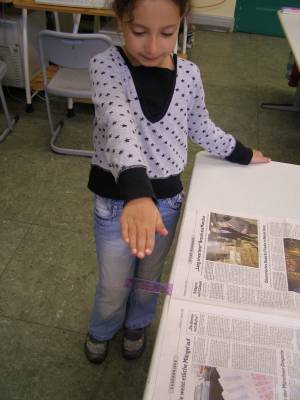 Lege das Lineal so auf den Tischrand, dass es etwas über den Tisch ragt. Lege nun das ausgebreitete Zeitungsblatt über den Teil des Lineals, der auf dem Tisch liegt. Schlage jetzt mit der Hand von oben auf das überstehende Lineal. |