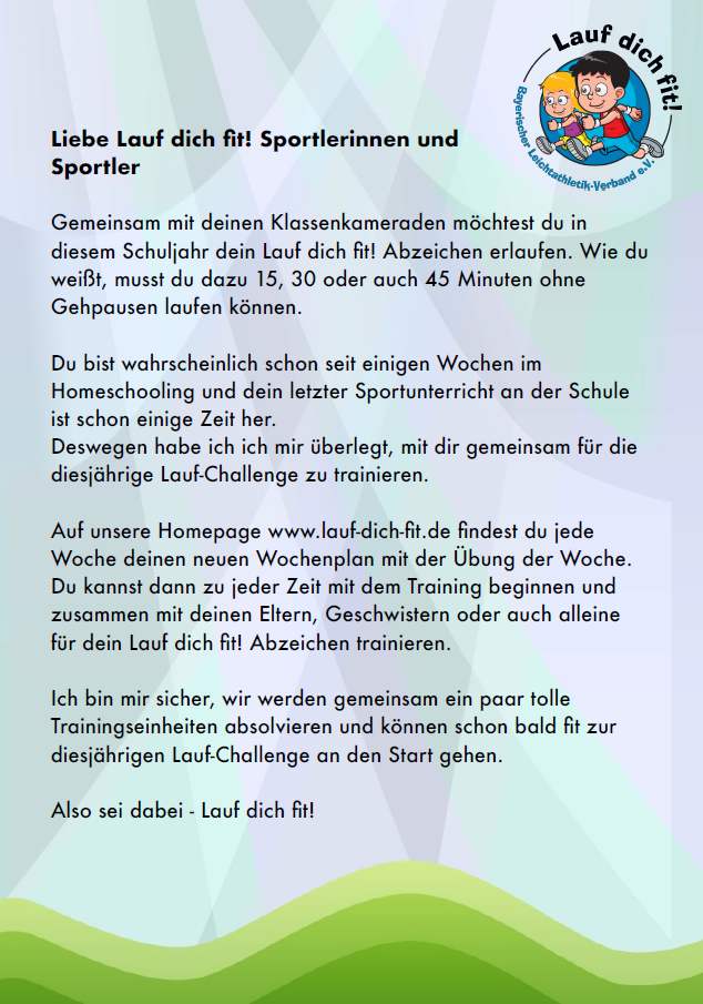 Lauf dich fit Unsere große Laufaktion findet auch in diesem Schuljahr statt. Allerdings trainierst du nicht in der Schule, sondern zu Hause. Hier findest du immer für 1 Woche die aktuellen Fitnessübungen: