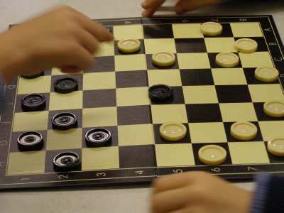 Spielsteine werden auf den schwarzen Feldern verteilt. Man darf mit den